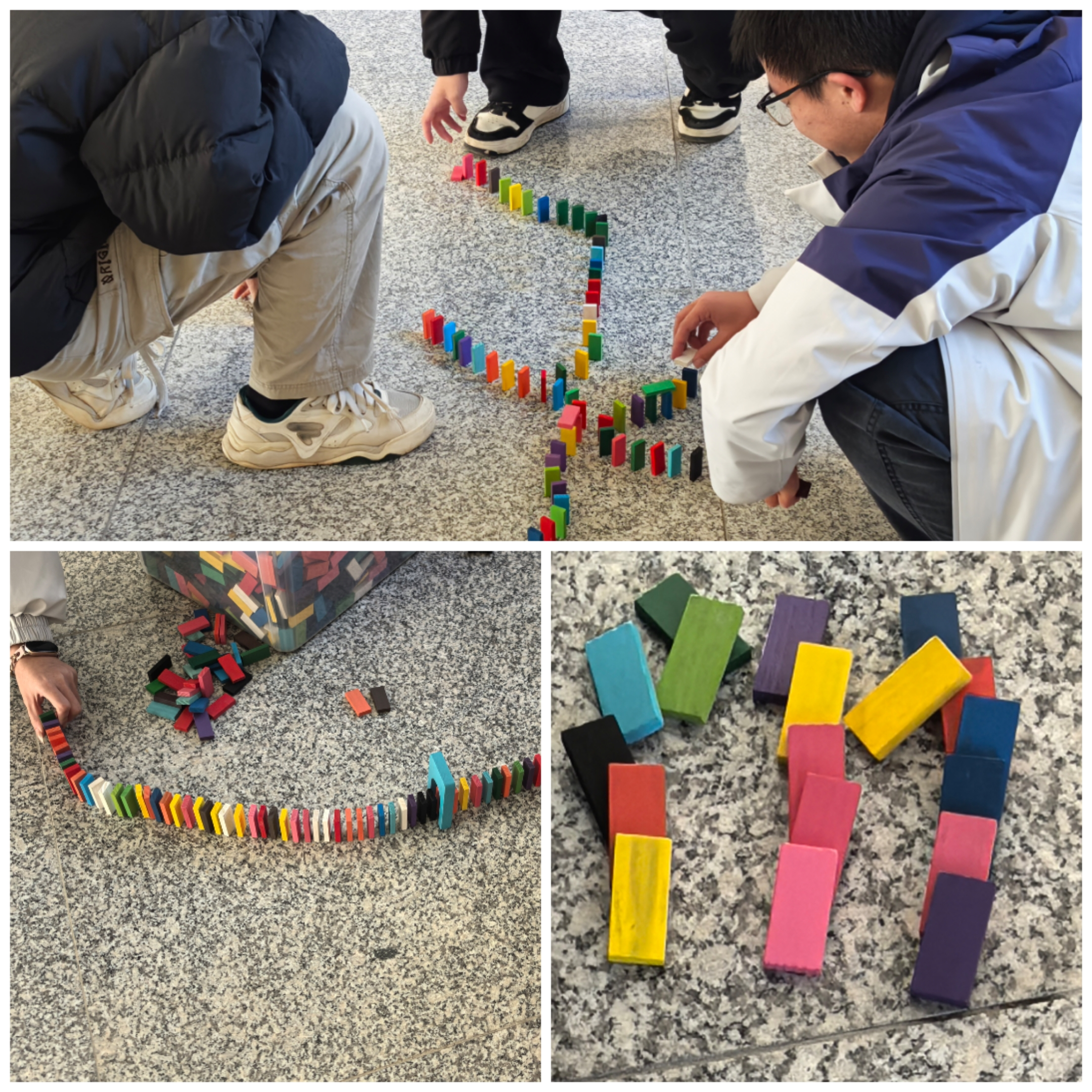 活动现场,色彩斑斓的多米诺骨牌成为同学们表达创意的载体。大家小心翼翼地将骨牌逐一摆放,从简单的直线到灵动的图案,从错落的造型到连贯的轨迹,每一块骨牌的精准对齐,都凝聚着大家的耐心与专注。即便偶尔出现骨牌倾倒的意外,也能迅速调整心态、相互鼓励,共同完成搭建。
